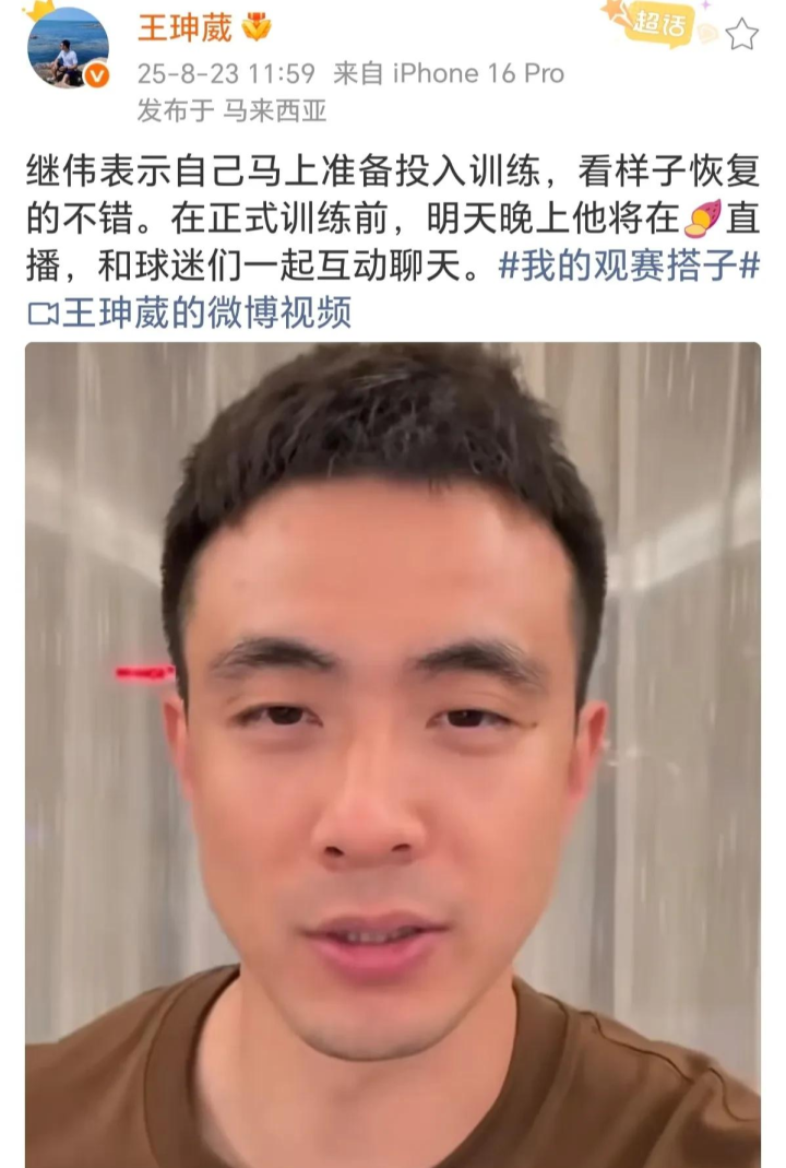 赵继伟在直播时就已经说了,表示自己马上准备投入训练,在正式训练之前,明天晚上,赵继伟将在直播间和球迷们一起互动聊天。